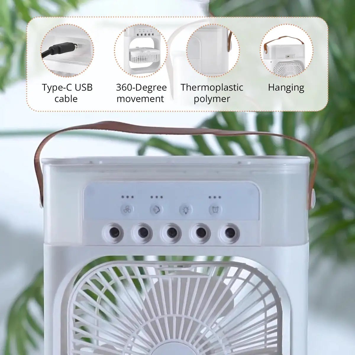 Use it as a personal air cooler, USB-powered fan, soft-glow night lamp, and mist humidifier — perfect for bedrooms, offices, dorms, or cars.