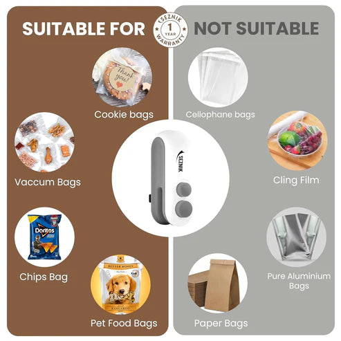 Suitable for Different Plastic Bags : This mini heat sealer machine can reseal various bags to keep food fresh and crispy, such as chips, snacks, sandwiches, candy, pet food vacuum bags, etc , also works for mylar bags, and plastic bags , but is not suitable for a wrap , cellophane bags, kraft paper bags, pure aluminium bags or thin food storage bags.